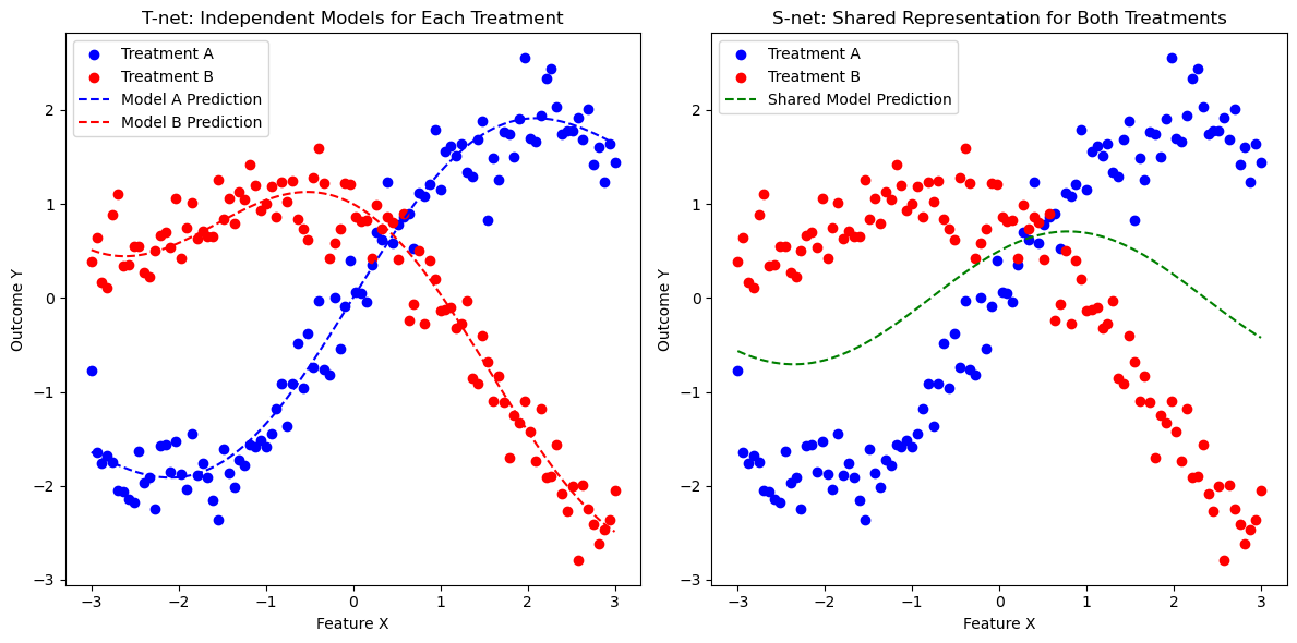 - T-net: 처치 효과를 추정하기 위해 각 처치 그룹에 대해 별도의 회귀 모델을 사용합니다. 이는 각 처치의 독립적인 예측을 가능하게 하며, 모델 간 상호 작용이 최소화됩니다.